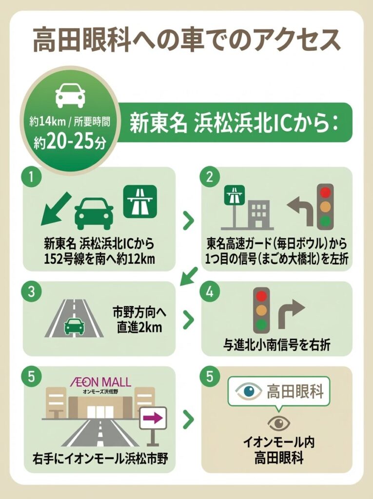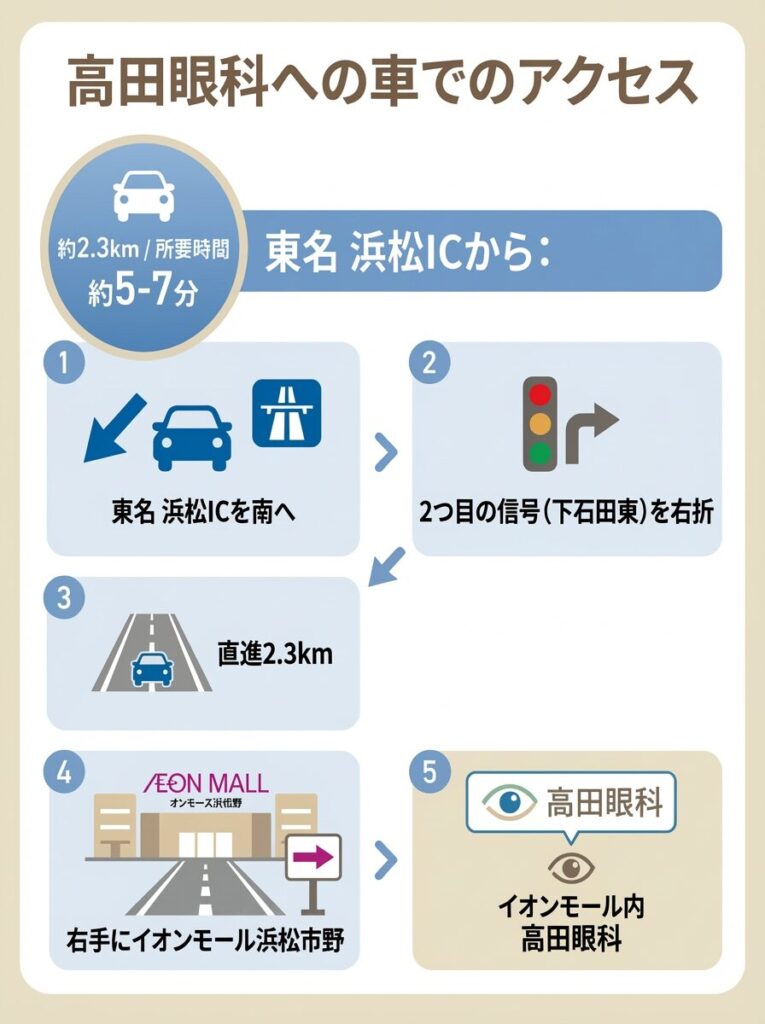 高田眼科は、イオンモール浜松市野のバス停のすぐ目の前にありますので、通院に便利です。